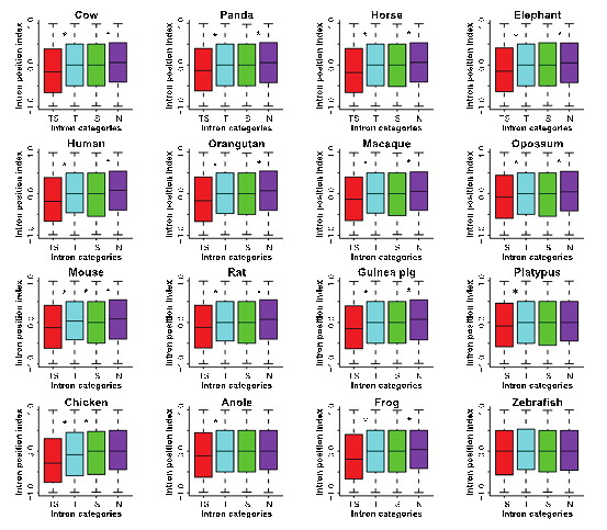 为了研究内含子序列中TE和SS的进化特征,科研人员选取了12种哺乳动物的基因组,按进化分支分成4组:灵长类、大型哺乳类、啮齿类和原始哺乳类,并用4种非哺乳类脊椎动物作为外群。研究表明:受TE或SS支配的内含子扩张机制在内含子长度、位置和基因功能等方面具有特定的分支特异性。研究发现,TE增加内含子长度的趋势比SS要强,TE和SS对哺乳动物的综合影响要大于任何两者之一的单独影响之简单加和,而在非哺乳脊椎动物中的情况则相反。