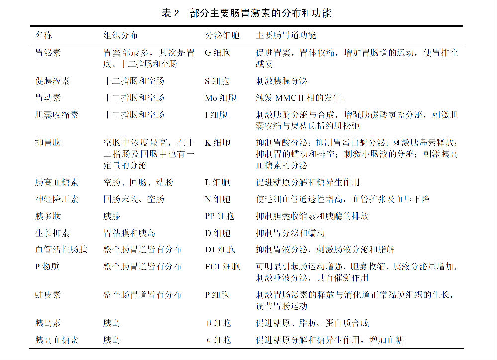 围绕“胃泌素假说”的争论一直持续到了1959年。Gregory和Tracy运用葡聚糖凝胶色谱法,首次从狗的肠胃组织中分离纯化得到了一个十七肽的胃泌素单体分子。接着,他们又相继得到了人源十七肽胃泌素以及更大分子量的前胃泌素(progastrin)和前胃泌素原(preprogastrin) [9]。其他肽类激素,如胆囊收缩素(cholecystokinin,CCK)、促胰液素(Secretin)和血管活性肠肽(vasoactive intestinalpeptide,VIP)等也都一一被相继纯化。其中,由小肠粘膜K细胞分泌的43肽分子—抑胃肽(Gastricinhibitory polypeptide,GIP)显示出与“肠抑胃素”相同的生理功能性质[10]。胆囊收缩素、生长抑素(somatostatin)和促胰液素等激素也被相继报导类似“肠抑胃素”的生理活性。迄今,被发现的胃肠肽类激素多达40余种(表一)。